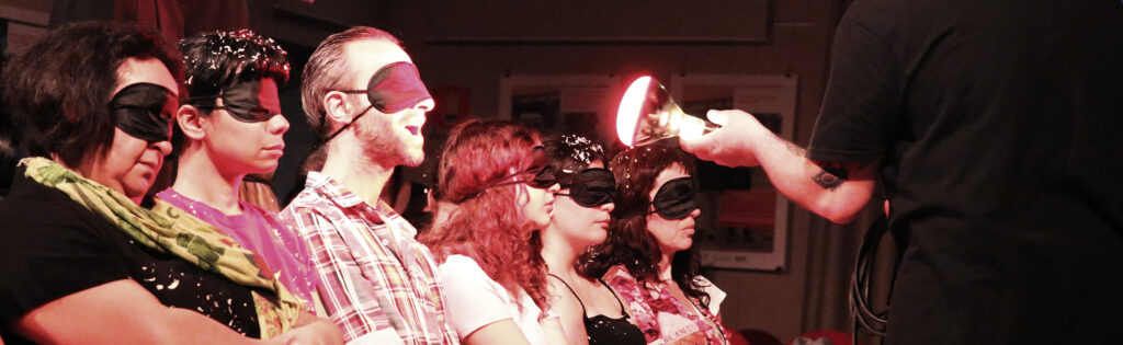 I Teatri della Mente è un format di spettacoli sensoriali a cui gli spettatori (max 50 per replica) assistono bendati e seduti al centro dello spazio scenico mentre attrici e attori recitano in mezzo a loro.