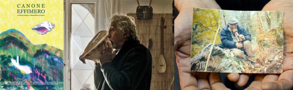 “Canone effimero” è un viaggio alla scoperta di un’Italia nascosta, invisibile, lontana dalle narrazioni correnti. I protagonisti di questa immersione sono singole persone o piccole comunità remote che lottano contro l’estinzione dei propri orizzonti simbolici. Sono i segni di una resistenza culturale e i fili misteriosi di un tessuto esistenziale, frammenti ritrovati di un ipotetico codice per la sopravvivenza con l’entroterra italiano fatto di volti, voci e storie. Gli strumenti antichi si collegano alla natura e all’ordine celeste, rappresentando anche l’incontro del Mediterraneo con l’Africa e l’Oriente.