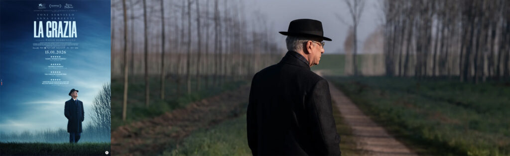 «”La Grazia” è un film d’amore. Questo motore inesauribile che determina il dubbio, la gelosia, la tenerezza, la commozione, la comprensione delle cose della vita, la responsabilità. L’amore e le sue articolate diramazioni sono viste e vissute attraverso gli occhi di Mariano De Santis, Presidente della Repubblica verosimile ma rigorosamente inventato. Mariano De Santis ama la moglie che non c’è più, la figlia e il figlio e le loro distanze generazionali, ama il diritto penale che ha studiato per tutta la vita. Mariano De Santis, dietro il suo aspetto serio e rigoroso, è un uomo d’amore. “La Grazia” è un film sul dubbio. E sulla necessità di praticarlo, soprattutto in politica, soprattutto oggi, in un mondo dove i politici si presentano troppo spesso col loro ottuso pacchetto di certezze che provocano solo danni, attriti e risentimenti, minando il benessere collettivo, il dialogo e la tranquillità generale. Mariano De Santis è un uomo mosso dal dubbio. “La Grazia” è un film sulla responsabilità. Un’altra dote che dovrebbe riguardarci tutti ma che, in modo particolare, dovrebbe caratterizzare l’essere politico, la figura che rappresenta gli altri e che guida o determina le scelte. Anche della responsabilità sentiamo la mancanza, quasi una latitanza, che lascia oggi il posto a inutili esibizionismi, a bordate muscolari, dannose, quando non apertamente pericolose. Mariano De Santis è un uomo responsabile. “La Grazia” è un film sulla paternità. Un politico può definirsi tale se incarna la dote alta e rassicurante della paternità, non se indossa i panni, cari a certi politici di oggi, del figlio scapestrato. Mariano De Santis è un padre nobile. Ma, da uomo intelligente e animato dal dubbio, sa quando è il momento di tornare a essere figlio. Quando l’età avanza e il presente diventa incomprensibile, anziché disprezzarlo o perdersi in vani rigurgiti nostalgici, si mette in ascolto del presente, attraverso i figli, che hanno una maggiore attitudine alla comprensione del mondo circostante. E si fida di loro. Mariano De Santis è un grande padre. “La Grazia” è un film su un dilemma morale. Concedere o meno la grazia a due persone che hanno commesso degli omicidi in circostanze, però, forse, perdonabili. Firmare o non firmare, da cattolico, una legge difficile sull’eutanasia. L’etica è una cosa seria. Tiene in piedi il mondo. E Mariano De Santis è un uomo serio». (Paolo Sorrentino)